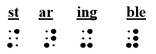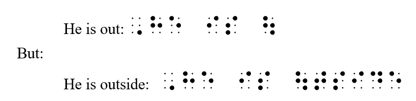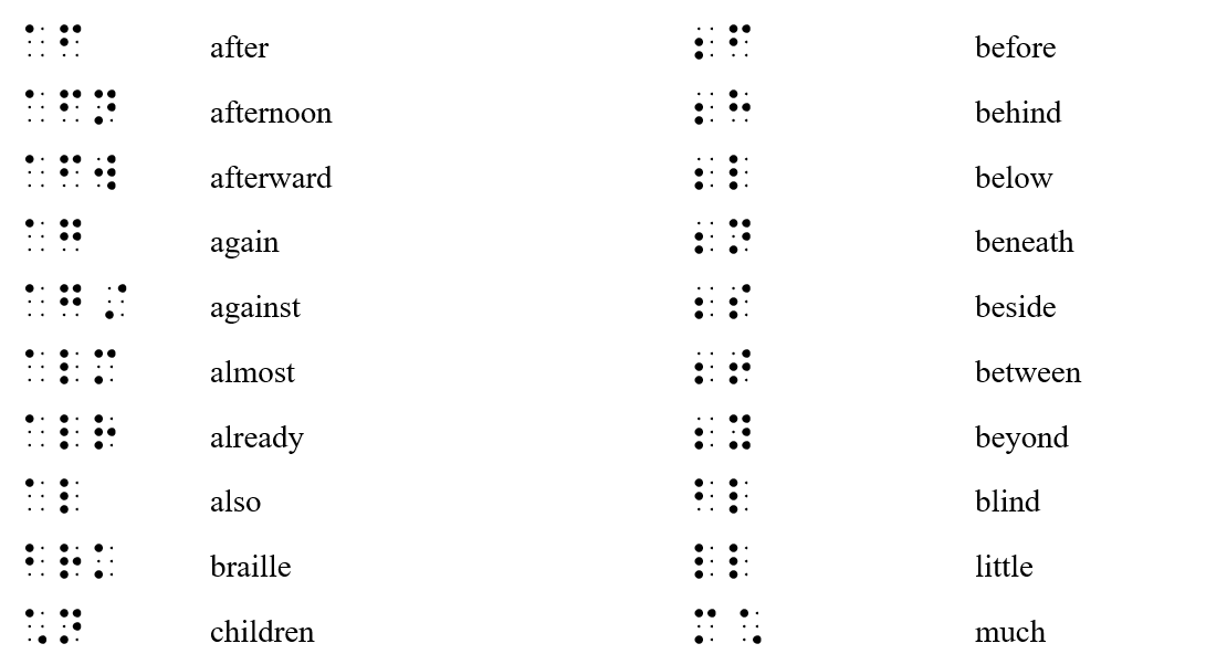 These four words, “be”, “were”, “his” and “was” are expressed by the above wordsigns, lower b, lower g, lower h, lower j, only where they are separated by a space from all other signs (except the capital indicator). Therefore, if the words adjoin lower punctuation in the print copy, they must be spelt out (for otherwise they would be regarded as punctuation themselves; e.g. a quote, etc.); and so, too, is the case where a letter is added to them, as: wasn’t, weren’t (BANA, 2002)