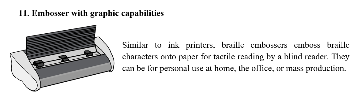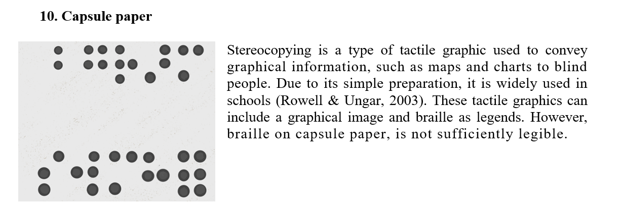 This topic introduces you to some equipment and materials used in developing tactile graphics. The equipment and materials include Stencil Embossing Kit (Crafty Graphics), Thermoform, Capsule paper, Embosser with graphic capabilities, Tactile Graphics Kits, Chang Tactual Diagram Kit, Tactile Graphics Software, Omnifix® Cubes, and Picture Maker.